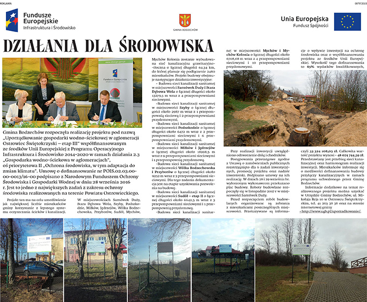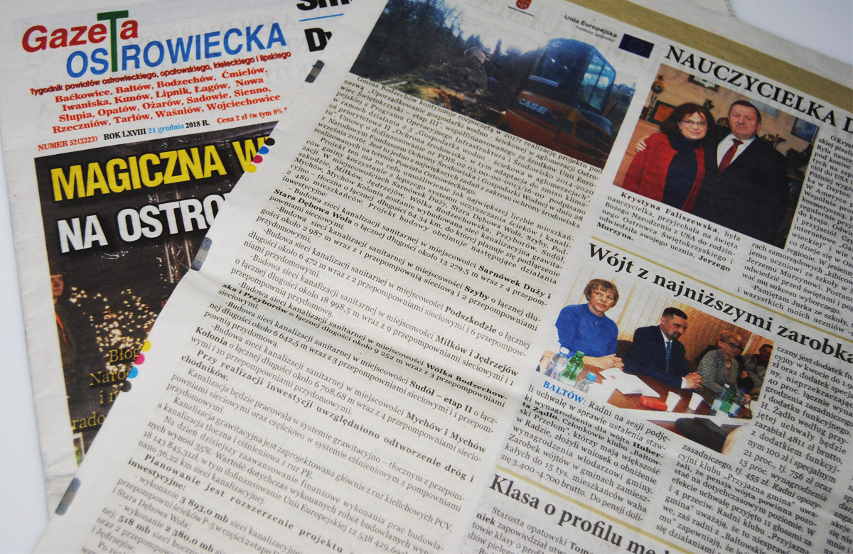 Prowadząc do 2020r. dla Gminy Bodzechów medialną obsługę projektu dofinansowanego przez Unię Europejską na budowę oczyszczalni ścieków oraz rozbudowę sieci wodociągowo - kanalizacyjnej opracowaliśmy i zamieściliśmy w Gazecie Ostrowieckiej, w Echu Dnia- Echo Ostrowieckie oraz Wiadomościach Świętokrzyskich artykuły informujące o zakresie projektu i postępie prac. Taka forma propagowania działań Gminy na rzecz mieszkańców i środowiska jest bardzo efektywna, dzięki regionalnym wydawnictwom informacje docierają bezpośrednio do mieszkańców gmin.